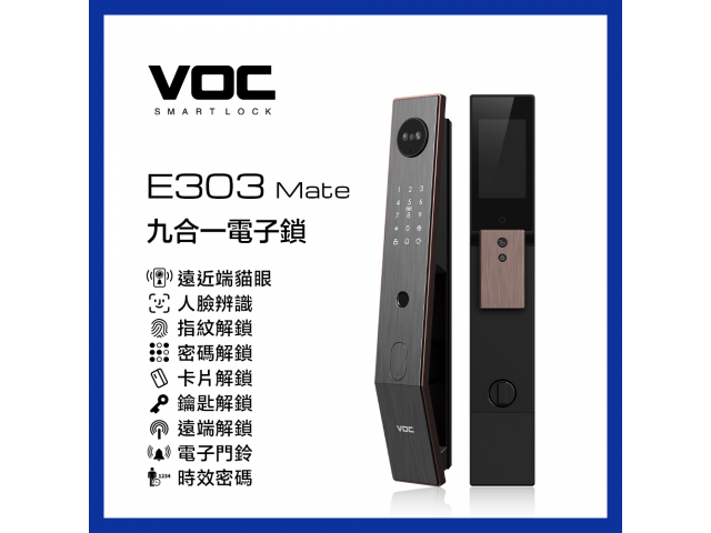 VOC電子鎖 E303 Mate 九合一電子門鎖是VOC目前所推出功能最強大的旗艦款大門電子鎖,當出門工作不在家期間可透過手機APP查看門外訪客、外出能也能遠端掌握家門外狀況;當有訪客按下門鈴時,手機APP會自動推播讓主人看清楚門外的狀況,確認訪客後再開門提升居家安全,當外出時還可透過手機App遠端與訪客溝通,並在有訪客按門鈴時從視訊貓眼自動錄製影片,在手機App中查看歷史影片;當發現有人在門前逗留時,鎖體拍攝短影片並推播警報訊息至手機App 。用戶可透過手機連接貓眼進行語音溝通,還可有效嚇跑盜賊;手機APP還能自動記錄成員回家時間,掌握家人每天的回家時間。
